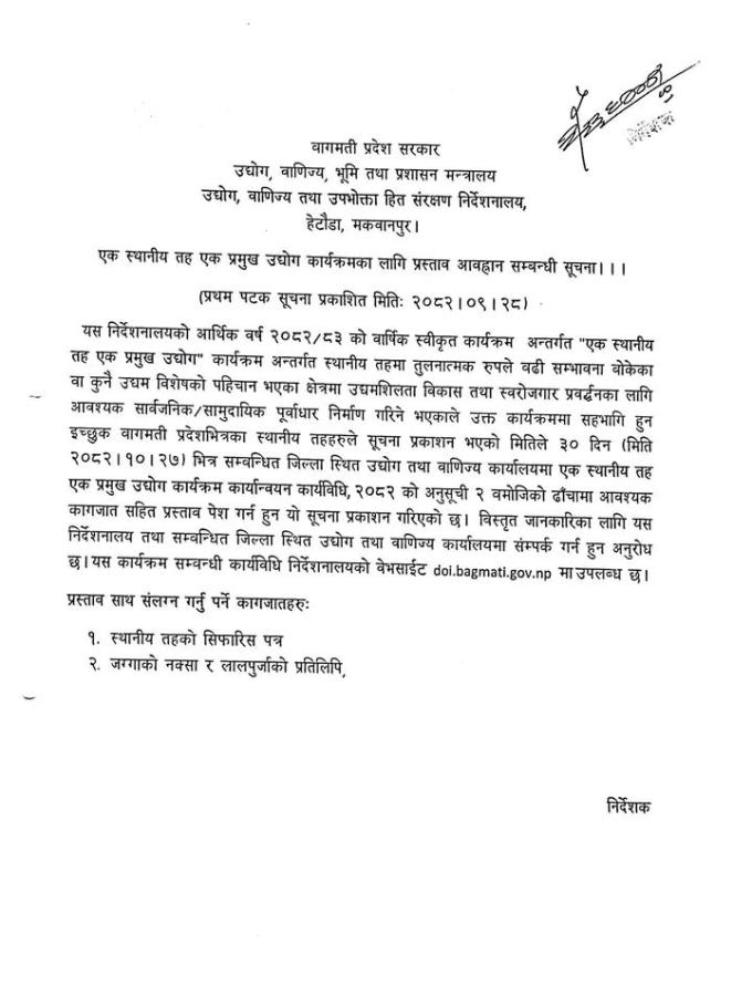 "एक स्थानीय तह एक प्रमुख उद्योग" तथा "एक वडा एक प्रमुख उद्योग " कार्यक्रमका लागि प्रस्ताव आह्वान सम्बन्धी सूचना !!!