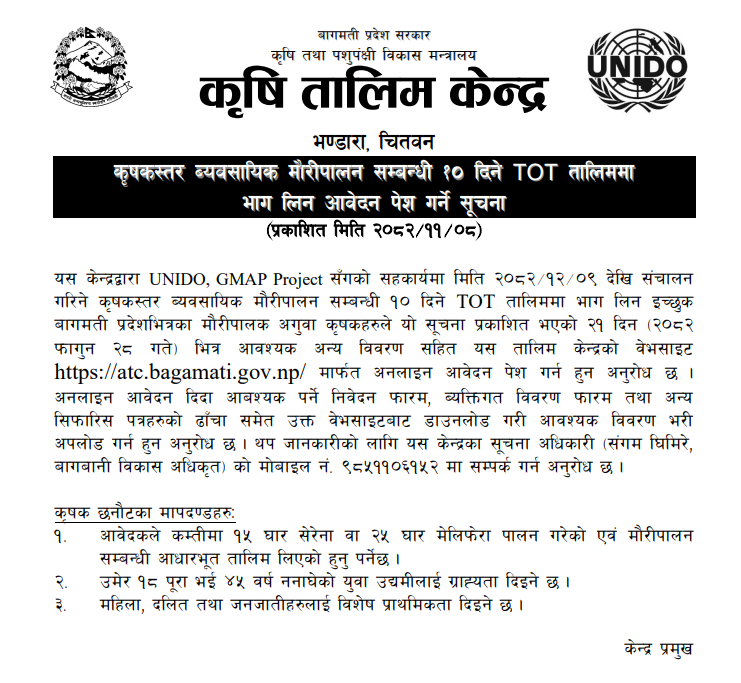 कृषकस्तर व्यवसायिक मौरिपालन सम्बन्धी १० दिने TOT तालिममा भाग लिन आवेदन पेश गर्ने सूचना !!!