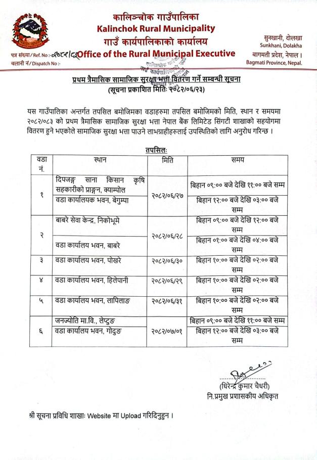 प्रथम त्रैमासिक सामाजिक सुरक्षा भत्ता वितरण गर्ने सम्बन्धी सूचना !!!