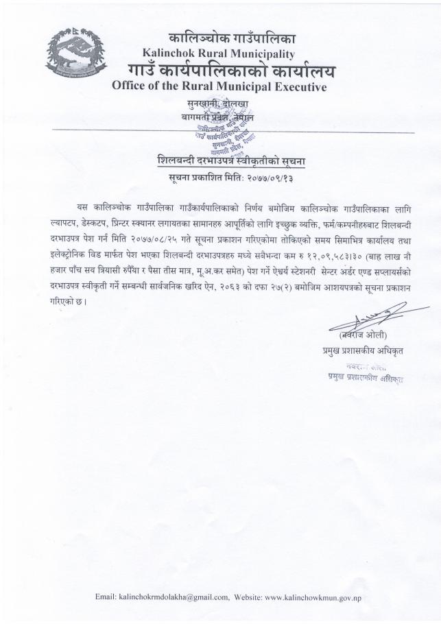 कम्प्युटर सम्बन्धी सामानहरुको शिलबन्दी दरभाउपत्र स्वीकृत गर्ने आशयको सूचना