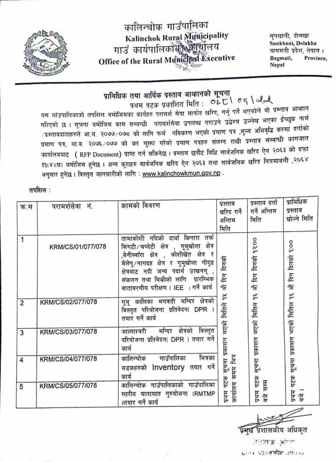 प्राविधिक तथा आर्थिक प्रस्ताव आह्वान सम्बन्धी सूचना र RFP-ToR (Gumu Kalika Bhagawoti Temple, Initial Environmental Examination (IEE), Jalpashwori Temple, RMTMP, Road Inventory)