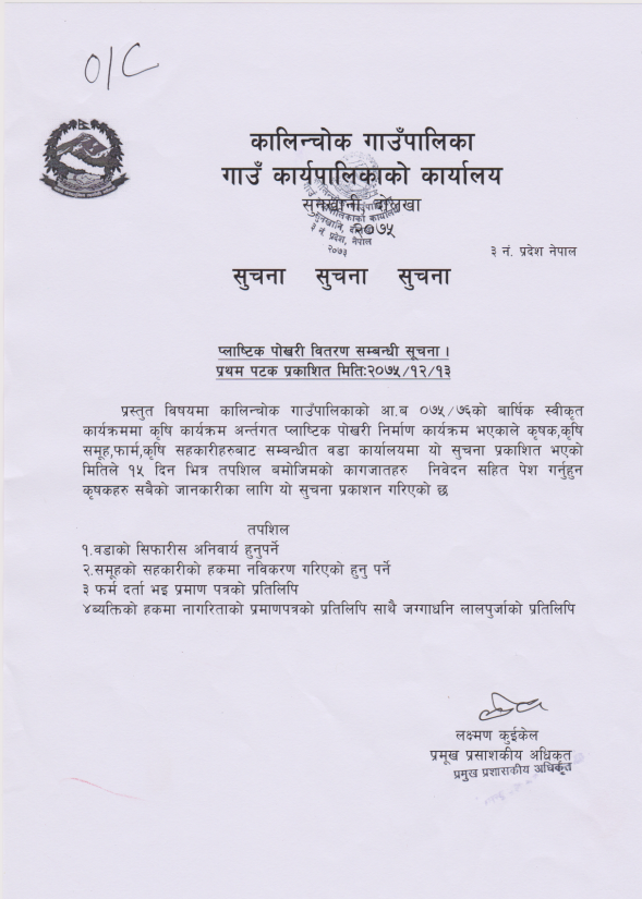प्लास्टिक पोखरी वितरण सम्बन्धी सूचना