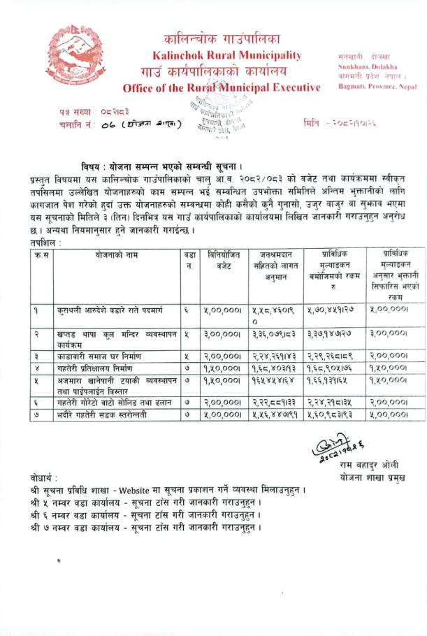 योजना सम्पन्न भएको सम्बन्धी सूचना !!!